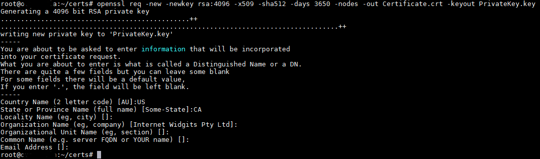 # openssl req -new -newkey rsa:4096 -x509 -sha512 -days 3650 -nodes -out Certificate.crt -keyout PrivateKey.key