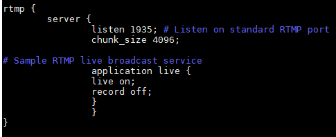 and add RTMP section for enable RTMP live service with listen on standard 1935 port: