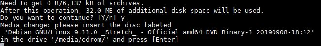Media change: please insert the disc labeled 'Debian GNU/Linux 9.11.0 _Stretch_ - Official amd64 DVD Binary-1 20190908-18:12' in the drive '/media/cdrom/' and press [Enter]