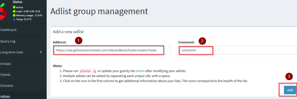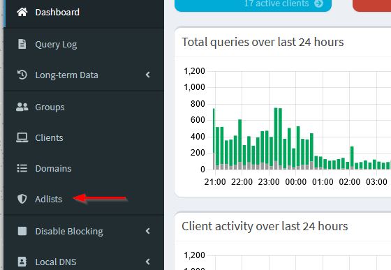 To add new blocklist to Pi-Hole select Adlists from left menu:
