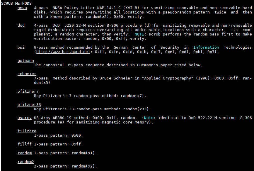 Scrub support about 15 pattern write methods such as: nnsa, dod, bsi, gutmann, schneier, pfitzner33,usarmy, fillzero, random …