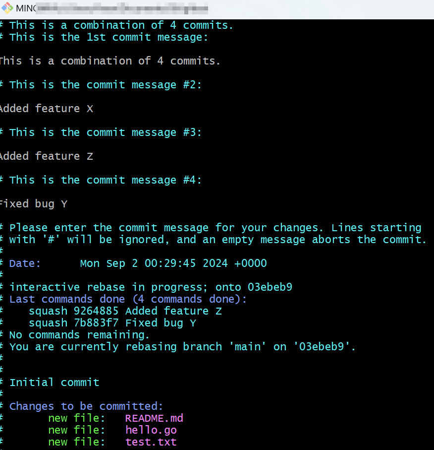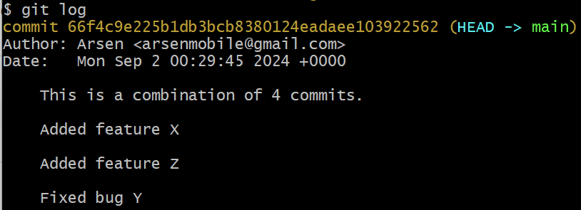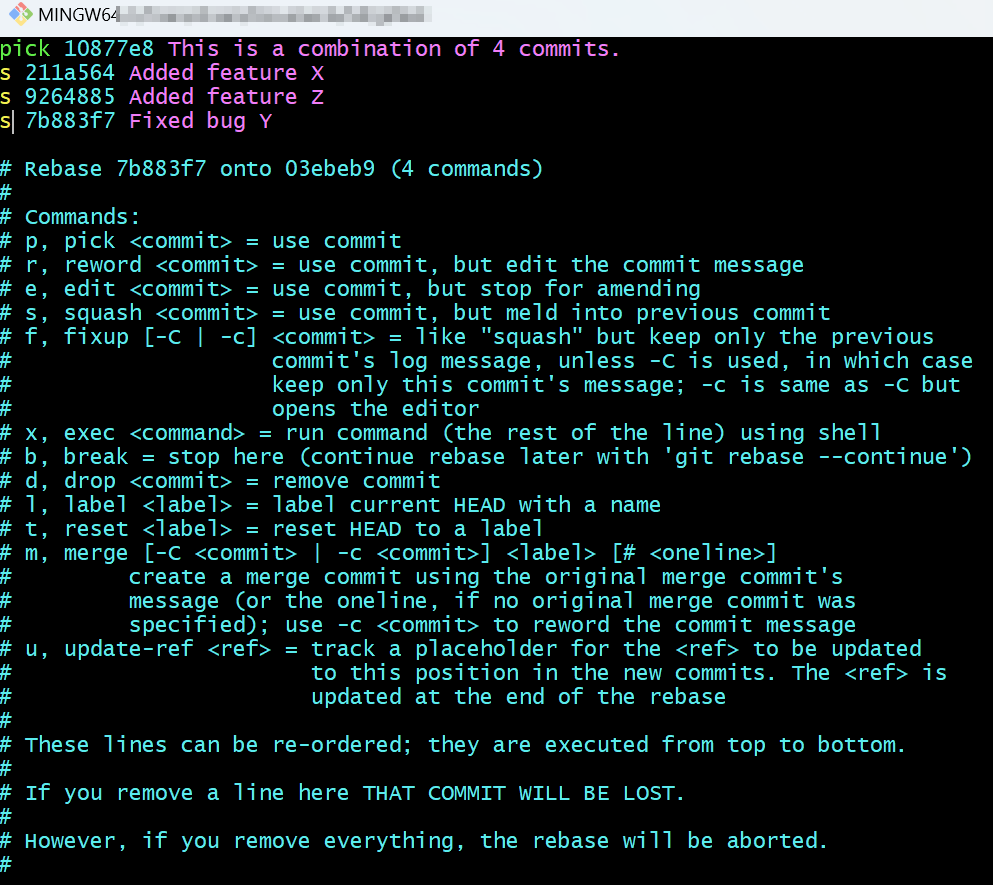 pick 1234567 Initial commit squash 2345678 Added feature X squash 3456789 Fixed bug Y