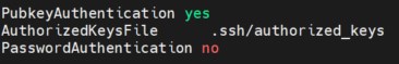 PubkeyAuthentication yes AuthorizedKeysFile .ssh/authorized_keys PasswordAuthentication no