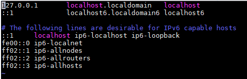 127.0.0.1 localhost.localdomain localhost 192.168.83.131 serv1 ::1 localhost6.localdomain6 localhost6 # The following lines are desirable for IPv6 capable hosts ::1 localhost ip6-localhost ip6-loopback fe00::0 ip6-localnet ff02::1 ip6-allnodes ff02::2 ip6-allrouters ff02::3 ip6-allhosts
