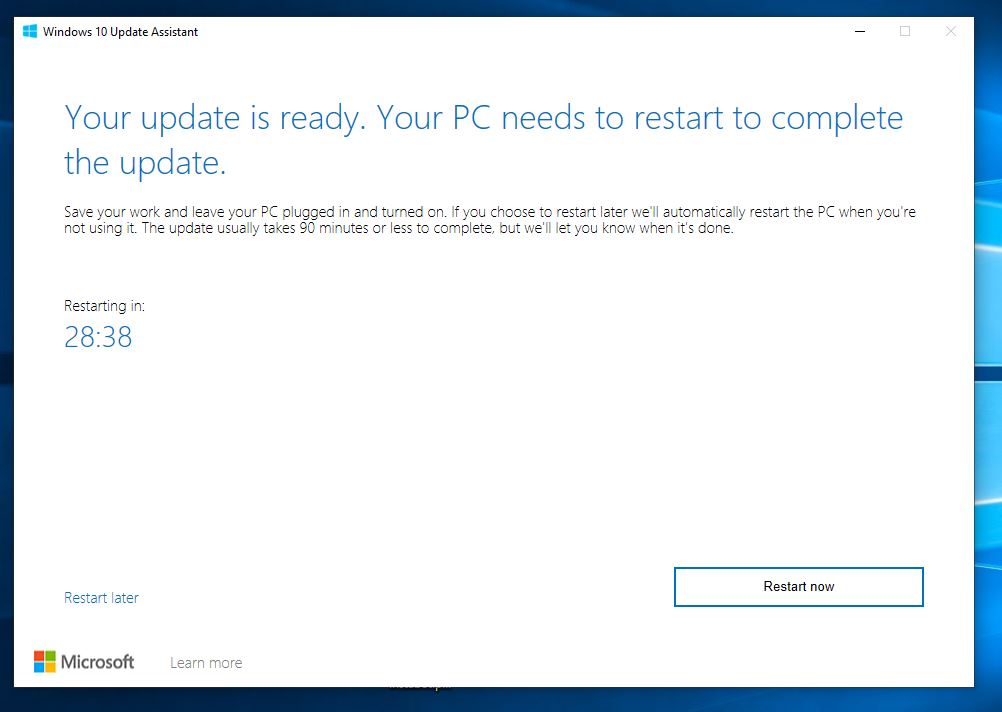 To complete updating Windows 10 May 2019 Update Assistant Tool required restart PC: